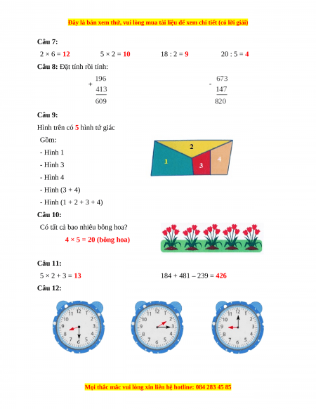 Câu 8: Đặt tính rồi tính: 196 + 413 673 – 147 ....................... ....................... ....................... ....................... ....................... ....................... Câu 9: Số ?