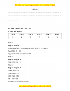 Vậy số liền trước của số 500 là: 499 Câu 2: Đáp án đúng là: B 728 = 700 + 20 + 8 Câu 3: Đáp án đúng là: B 319 + 215 = 534 726 – 218 = 508 164 + 721 = 885 681 – 80 = 601