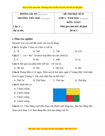 Hoa là ngày 3 tháng 2. Vậy sinh nhật Hoa là thứ mấy? A. Thứ Tư B. Thứ Năm C. Thứ Sáu D. Thứ Bảy Câu 5: Hình bên có: A. 2 hình vuông B. 3 hình vuông C. 4 hình vuông D. 5 hình vuông