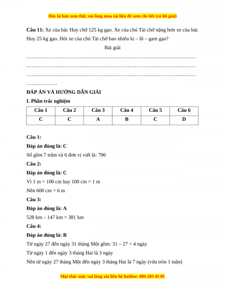 Câu 11: Xe của bác Huy chở 125 kg gạo. Xe của chú Tài chở nặng hơn xe của bác