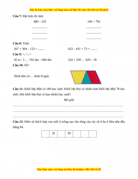 Câu 7: Đặt tính rồi tính: 480 – 235 146 + 792 ................... ................... ................... ................... ................... ................... Câu 8: Tính: 267 + 304 – 125 = ........ 623 – 431 + 73 = ........ Câu 9: >; <; = 45 m : 5 … 742 dm – 660 dm 324 + 258 … 620 – 18 Câu 10: Số?