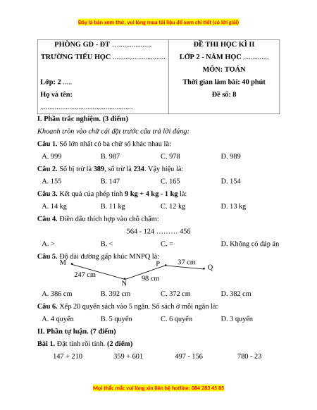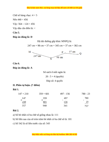 II. Phần tự luận. (7 điểm) Bài 1. 147 + 210 359 + 601 497 - 156 780 - 23 Bài 2.