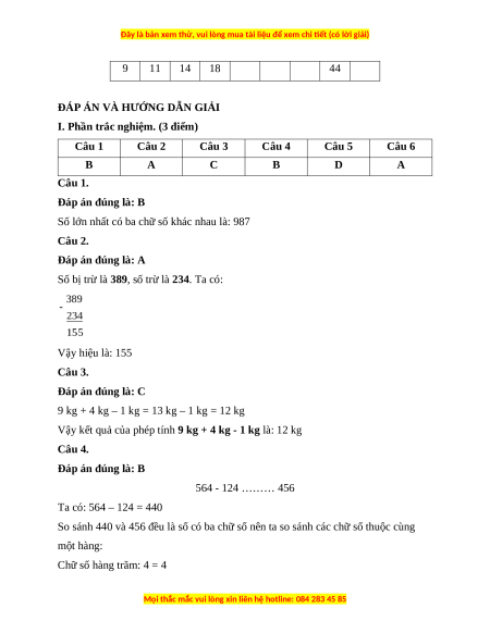 Số lớn nhất có ba chữ số khác nhau là: 987 Câu 2. Đáp án đúng là: A