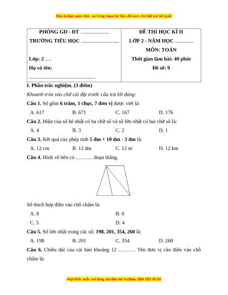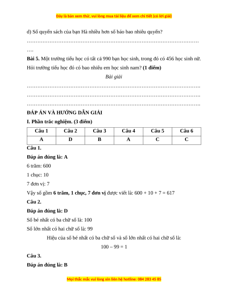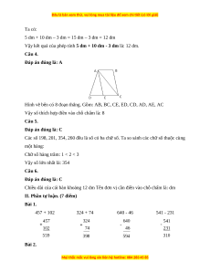 I. Phần trắc nghiệm. (3 điểm) Câu 1 Câu 2 Câu 3 Câu 4 Câu 5 Câu 6 A D B A C C Câu 1. Đáp án đúng là: A 6 trăm: 600 1 chục: 10 7 đơn vị: 7
