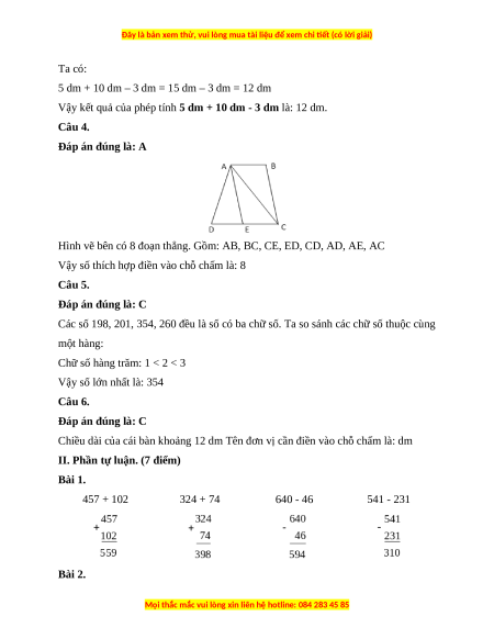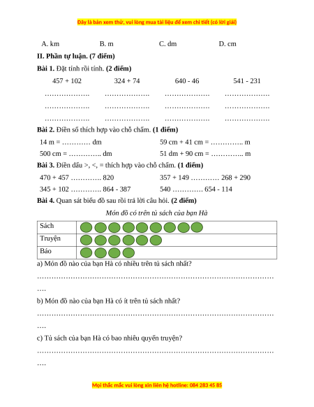 II. Phần tự luận. (7 điểm) Bài 1. 457 + 102 324 + 74 640 - 46 541 - 231 Bài 2.