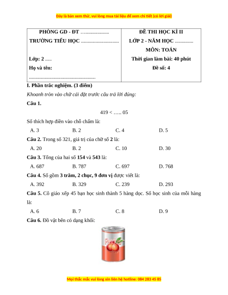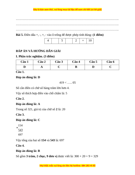 I. Phần trắc nghiệm. (3 điểm) Câu 1 Câu 2 Câu 3 Câu 4 Câu 5 Câu 6 D A C B D C Câu 1. Đáp án đúng là: D 419 < ….. 05