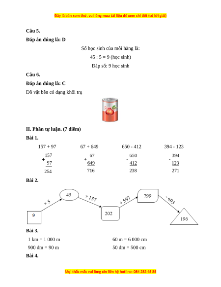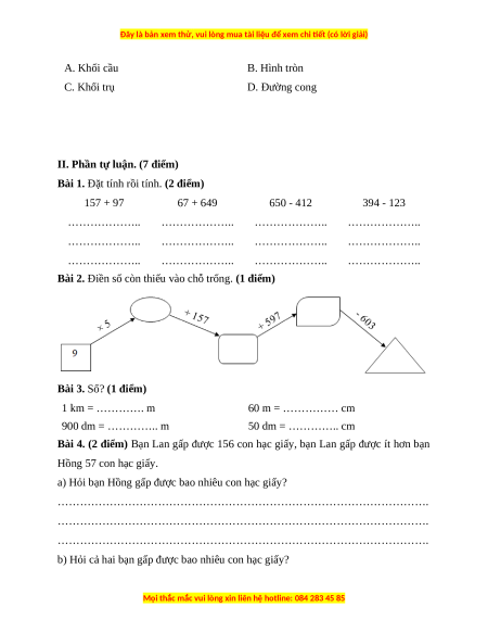 II. Phần tự luận. (7 điểm) Bài 1. 157 + 97 67 + 649 650 - 412 394 - 123 Bài 2. Bài 3. 1 km = 1 000 m 60 m = 6 000 cm 900 dm = 90 m 50 dm = 500 cm Bài 4.