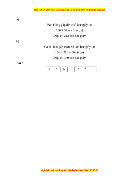 Bài 4. (2 điểm) Bạn Lan gấp được 156 con hạc giấy, bạn Lan gấp được ít hơn bạn Hồng 57 con hạc giấy.