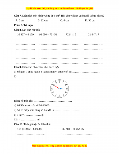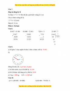 Câu 7. Diện tích một hình vuông là 9 cm2. Hỏi chu vi hình vuông đó là bao nhiêu? A. 3 cm B. 12 cm C. 4 cm D. 36 cm Phần 2. Tự luận