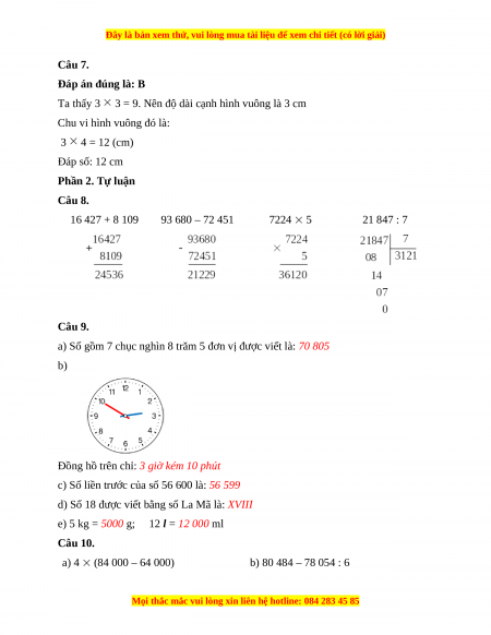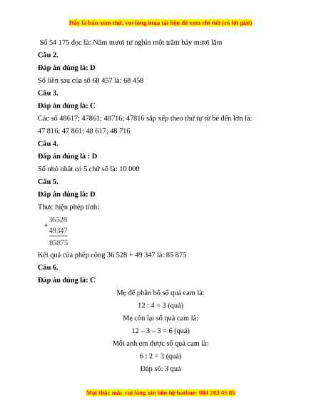 Số nhỏ nhất có 5 chữ số là: 10 000 Câu 5. Đáp án đúng là: D Thực hiện phép tính: