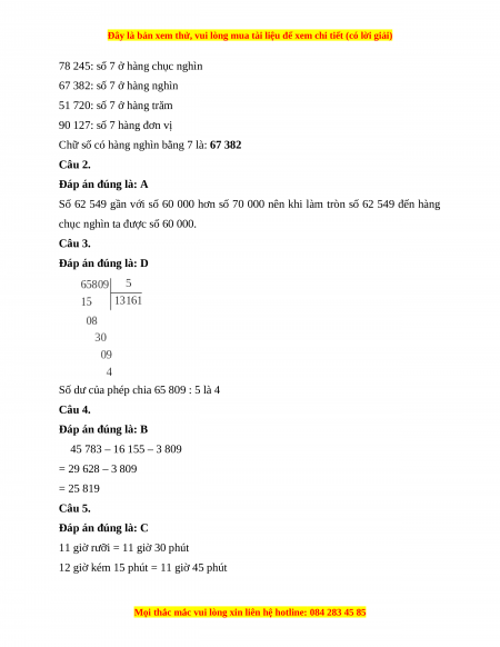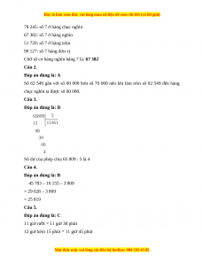 Số dư của phép chia 65 809 : 5 là 4 Câu 4. Đáp án đúng là: B 45 783 – 16 155 – 3 809 = 29 628 – 3 809 = 25 819 Câu 5. Đáp án đúng là: C