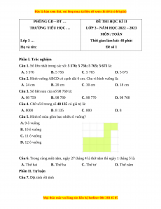 Câu 1. Số lớn nhất trong các số: 5 576; 5 756; 5 765; 5 675 là: A. 5 576 B. 5 756 C. 5 765 D. 5 675