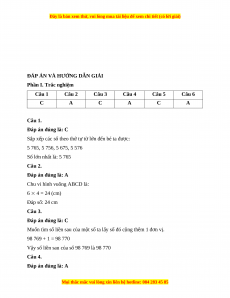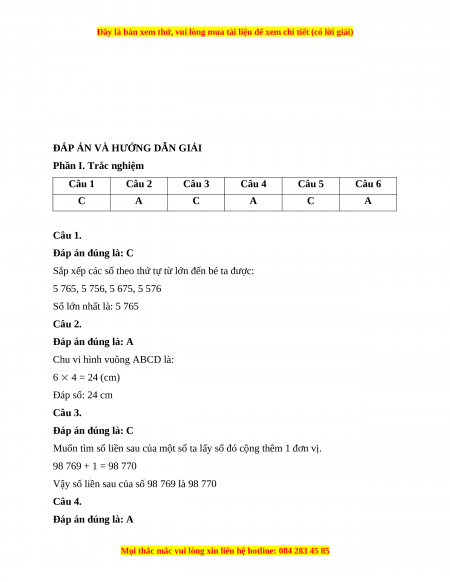 Sắp xếp các số theo thứ tự từ lớn đến bé ta được: 5 765, 5 756, 5 675, 5 576 Số lớn nhất là: 5 765 Câu 2. Đáp án đúng là: A Chu vi hình vuông ABCD là: 6 4 = 24 (cm) Đáp số: 24 cm Câu 3. Đáp án đúng là: C