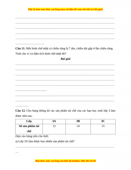 Câu 12. Cho bảng thống kê các sản phẩm tái chế của các bạn học sinh lớp 3 làm được như sau: Lớp 3A 3B 3C Số sản phẩm tái 12 14 15 chế