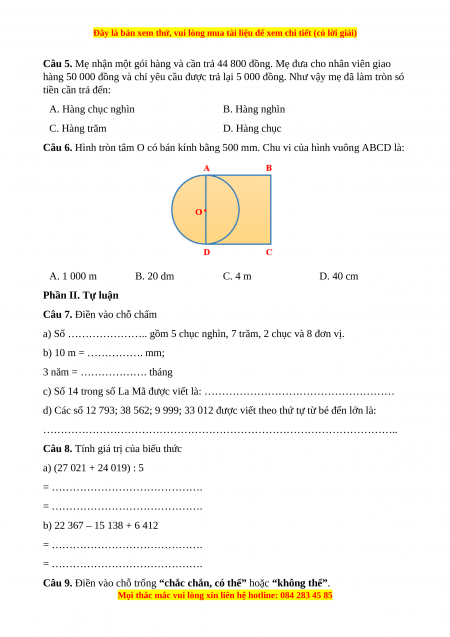Câu 6. Hình tròn tâm O có bán kính bằng 500 mm. Chu vi của hình vuông ABCD là: A. 1 000 m B. 20 dm C. 4 m D. 40 cm Phần II. Tự luận