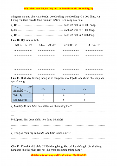 Câu 10. Đặt tính rồi tính 36 053 + 17 528 65 652 – 29 617 47 050 2 35 849 : 7 ......................... ......................... ......................... ......................... ......................... ......................... ......................... ......................... ......................... ......................... ......................... ......................... ......................... ......................... ......................... ......................... ......................... ......................... ......................... ......................... ......................... ......................... ......................... .........................