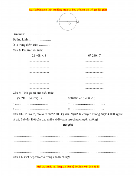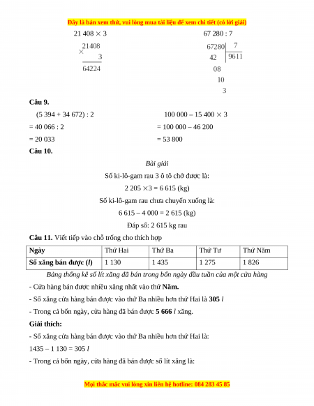 Câu 10. Có 3 ô tô, mỗi ô tô chở 2 205 kg rau. Người ta chuyển xuống được 4 000 kg rau