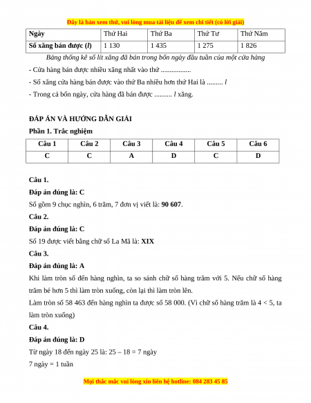 Làm tròn số 58 463 đến hàng nghìn ta được số 58 000. (Vì chữ số hàng trăm là 4 < 5, ta làm tròn xuống) Câu 4. Đáp án đúng là: D