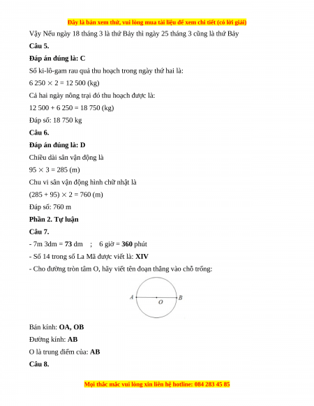 Cả hai ngày nông trại đó thu hoạch được là: 12 500 + 6 250 = 18 750 (kg) Đáp số: 18 750 kg Câu 6. Đáp án đúng là: D