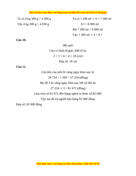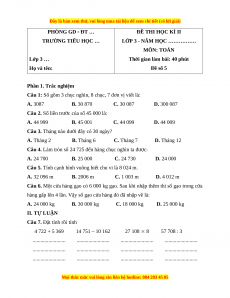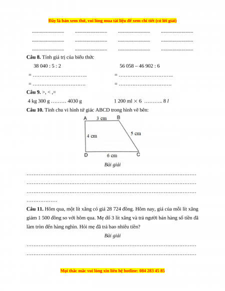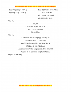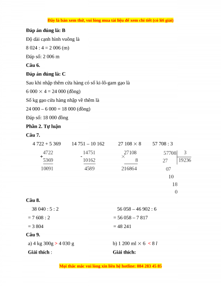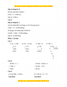 24 000 – 6 000 = 18 000 (đồng) Đáp số: 18 000 đồng Phần 2. Tự luận Câu 7. 4 722 + 5 369 14 751 – 10 162 27 108 8 57 708 : 3 Câu 8. 38 040 : 5 : 2 56 058 – 46 902 : 6 = 7 608 : 2 = 56 058 – 7 817 = 3 804 = 48 241 Câu 9.