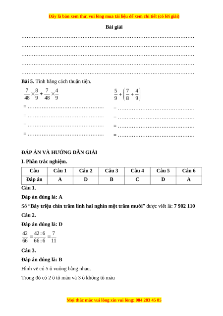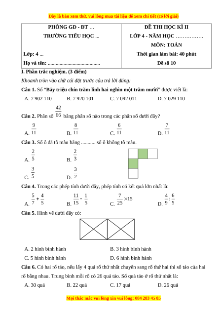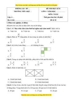 Câu 1. Số “Bảy triệu chín trăm linh hai nghìn một trăm mười” được viết là: A. 7 902 110 B. 7 920 101 C. 7 092 011 D. 7 029 110 Câu 2. Phân số