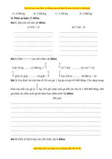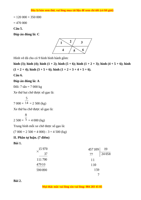 (1 + 2 + 4); hình (3 + 5 + 6); hình (1 + 2 + 3 + 4 + 5 + 6). Câu 6. Đáp án đúng là: A Đổi: 7 tấn = 7 000 kg