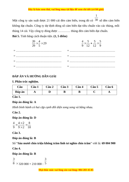 Bài 5. Tính bằng cách thuận tiện. (1, 5 điểm)