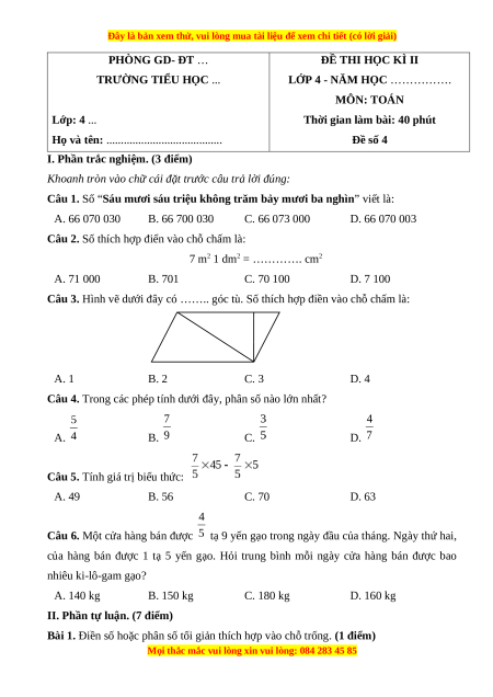 Đề thi cuối kì 2 Toán lớp 4 Cánh diều - Đề 4