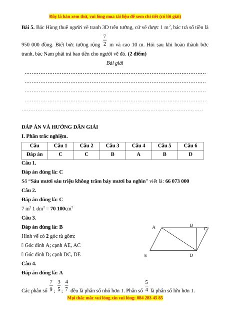 Số “Sáu mươi sáu triệu không trăm bảy mươi ba nghìn” viết là: 66 073 000 Câu 2. Đáp án đúng là: C 7 m2 1 dm2 = 70 100cm2 Câu 3. Đáp án đúng là: B A B C