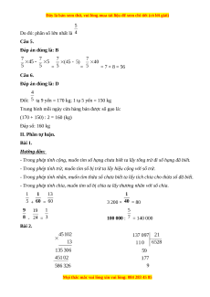 Trung bình mỗi ngày cửa hàng bán được số gạo là: (170 + 150) : 2 = 160 (kg) Đáp số: 160 kg II. Phần tự luận. Bài 1. Hướng dẫn: