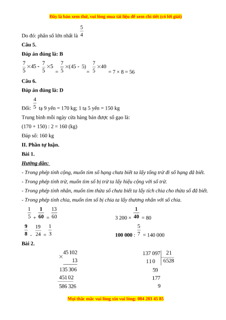 Do đó: phân số lớn nhất là Câu 5. Đáp án đúng là: B = = = 7 × 8 = 56 Câu 6. Đáp án đúng là: D
