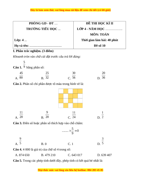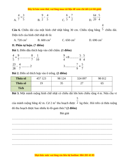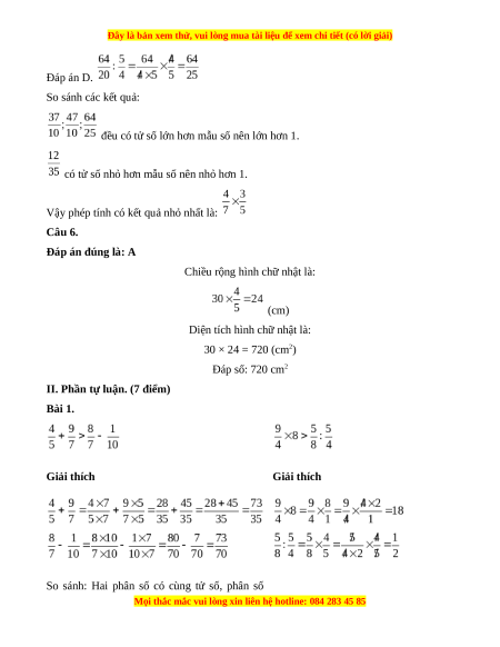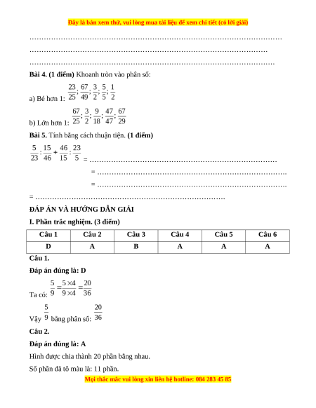 I. Phần trắc nghiệm. (3 điểm) Câu 1 Câu 2 Câu 3 Câu 4 Câu 5 Câu 6 D A B A A A Câu 1. Đáp án đúng là: D Ta có: Vậy bằng phân số: Câu 2. Đáp án đúng là: A