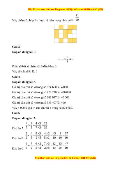 Vậy phân số chỉ phần được tô màu trong hình vẽ là: Câu 3. Đáp án đúng là: B