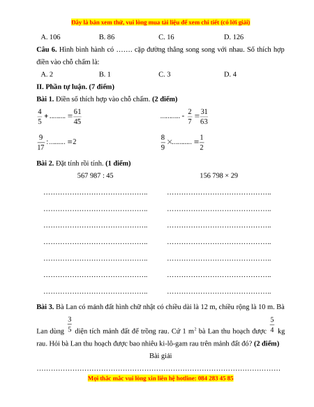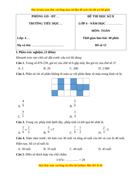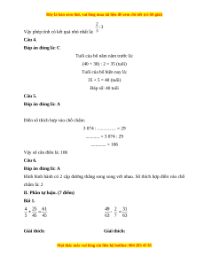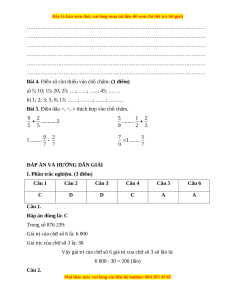 I. Phần trắc nghiệm. (3 điểm) Câu 1 Câu 2 Câu 3 Câu 4 Câu 5 Câu 6 C D D C A A Câu 1. Đáp án đúng là: C Trong số 876 239:
