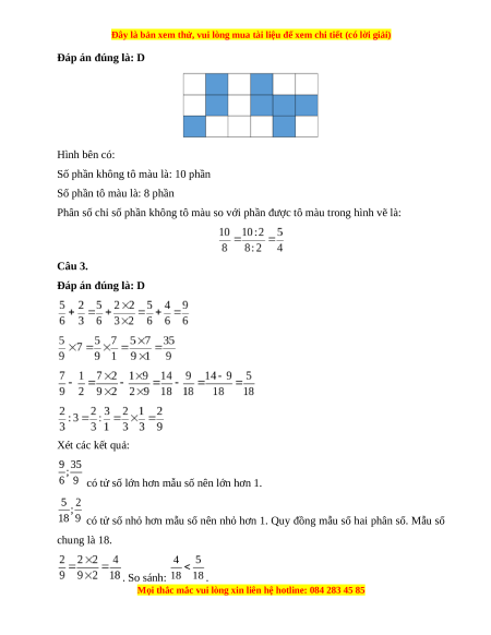 Phân số chỉ số phần không tô màu so với phần được tô màu trong hình vẽ là: Câu 3. Đáp án đúng là: D Xét các kết quả: