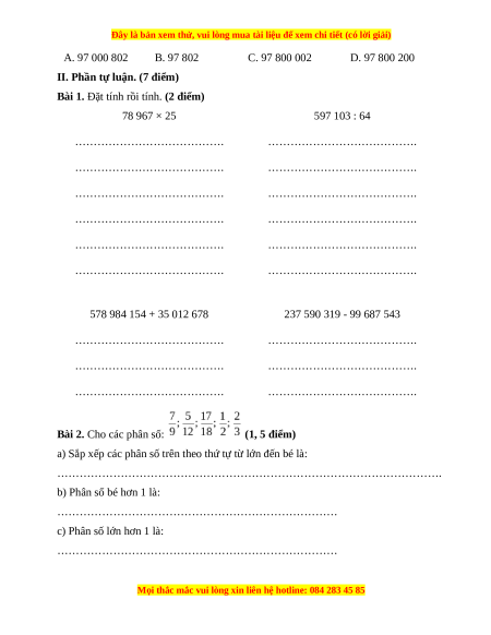 Bài 1. Đặt tính rồi tính. (2 điểm) 78 967 × 25 597 103 : 64