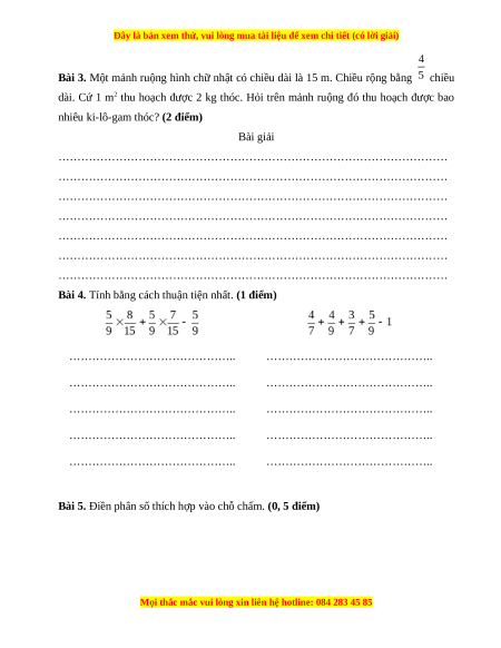 Bài 5. Điền phân số thích hợp vào chỗ chấm. (0, 5 điểm)