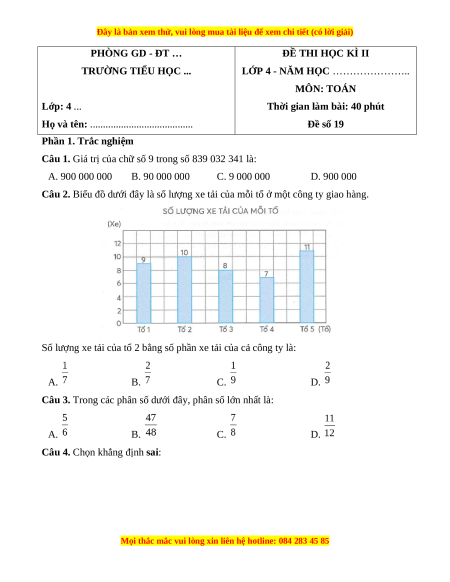 Câu 3. Trong các phân số dưới đây, phân số lớn nhất là: A. B. C. D.