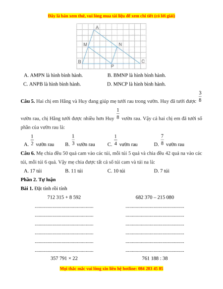 túi, mỗi túi 6 quả. Vậy mẹ chia được tất cả số túi cam và túi na là: A. 17 túi B. 11 túi C. 10 túi D. 7 túi Phần 2. Tự luận