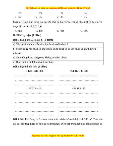 Bài 2. Đặt tính rồi tính. (2 điểm) 6 120 + 347 980 654 012 - 32 970