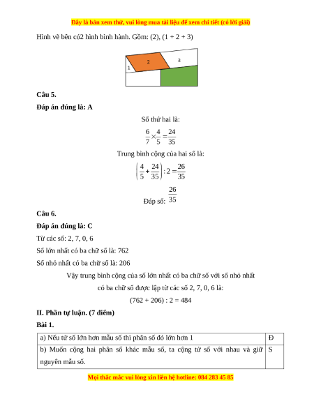 Câu 5. Số thứ nhất bằng . Số thứ hai bằng số thứ nhất. Trung bình cộng của hai số đó là: