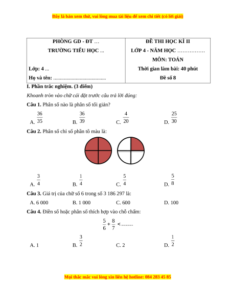 Câu 4. Điền số hoặc phân số thích hợp vào chỗ chấm: A. 1 B. C. 2 D.