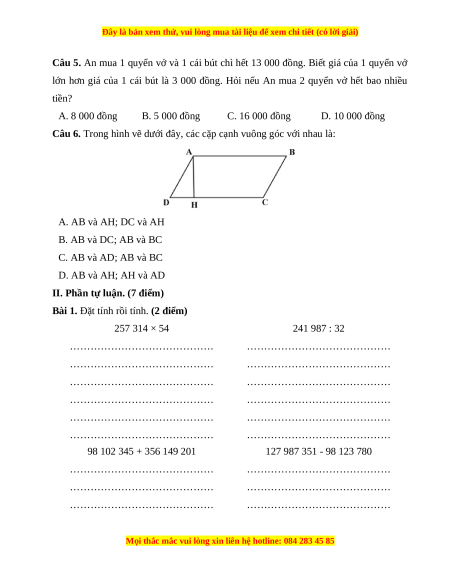 Câu 5. An mua 1 quyển vở và 1 cái bút chì hết 13 000 đồng. Biết giá của 1 quyển vở