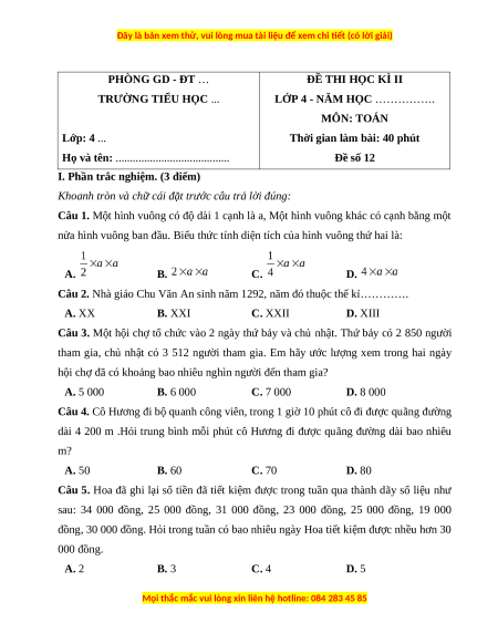 Đề thi cuối kì 2 Toán lớp 4 Kết nối tri thức (Đề 12)