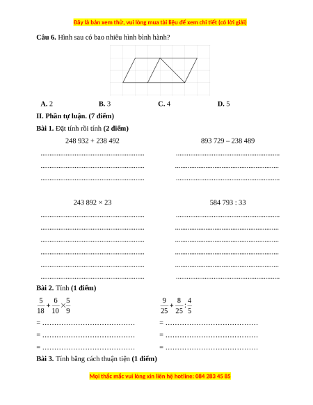 Bài 1. Đặt tính rồi tính (2 điểm) 248 932 + 238 492 893 729 – 238 489