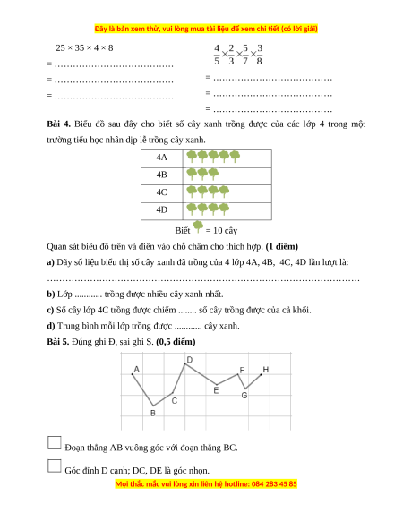 Bài 4. Biểu đồ sau đây cho biết số cây xanh trồng được của các lớp 4 trong một