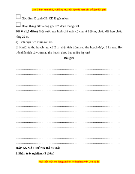 Bài 6. (1,5 điểm) Một vườn rau hình chữ nhật có chu vi 180 m, chiều dài hơn chiều rộng 22 m.