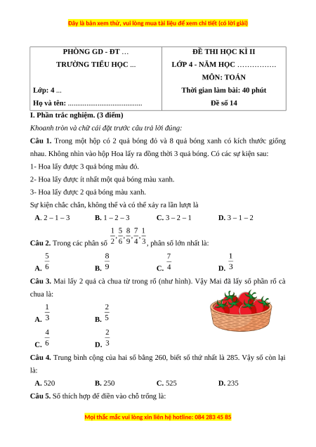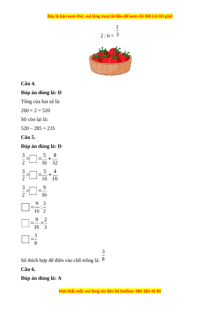 , phân số lớn nhất là: Câu 3. Đáp án đúng là: A Rổ có 6 quả cà chua.