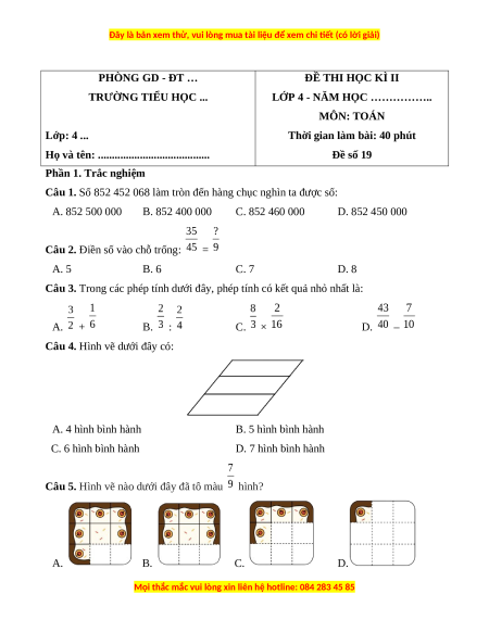 Đề thi cuối kì 2 Toán lớp 4 Kết nối tri thức (Đề 19)