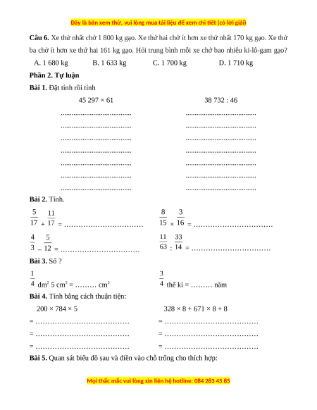ba chở ít hơn xe thứ hai 161 kg gạo. Hỏi trung bình mỗi xe chở bao nhiêu ki-lô-gam gạo? A. 1 680 kg B. 1 633 kg C. 1 700 kg D. 1 710 kg Phần 2. Tự luận